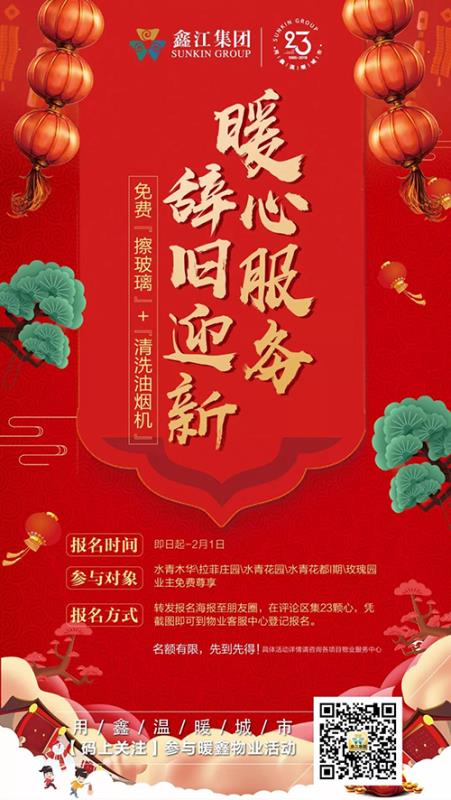 鑫江物業心疼業主們一年來的辛苦忙碌,更是回報您一直以來的支持與信賴。2月1日—2月11日,我們推出免費“擦玻璃”和“清洗油煙機”暖心物業服務,讓您解放雙手,放松心情,好好享受年底假期,高高興興過大年!