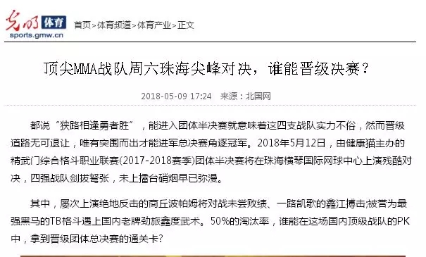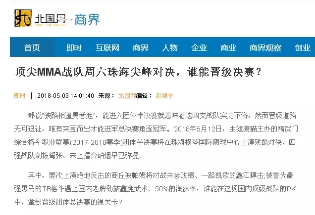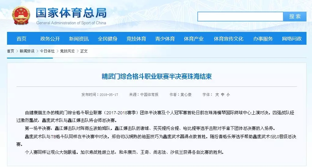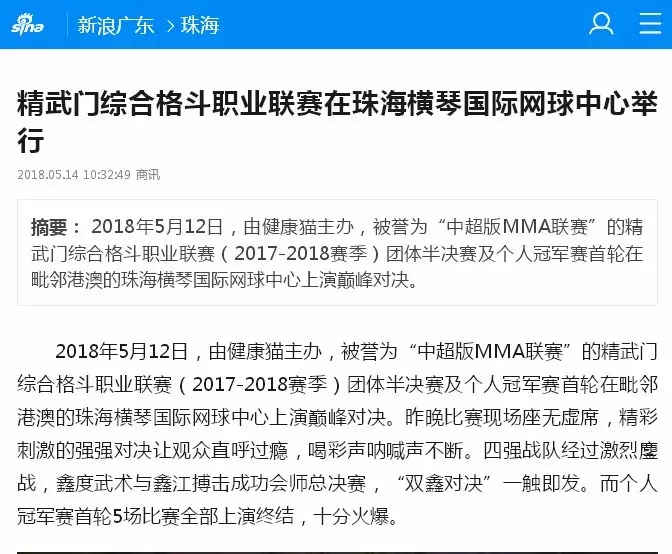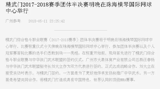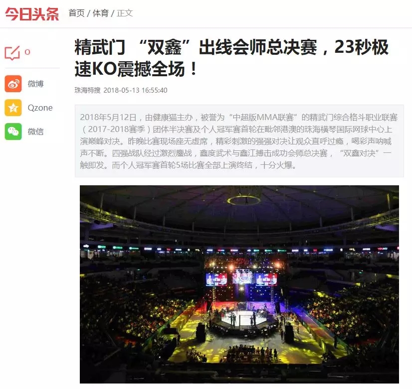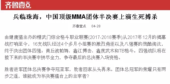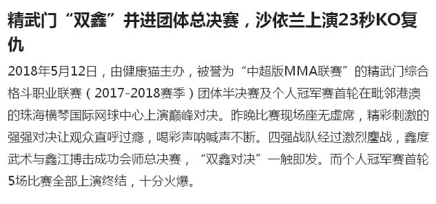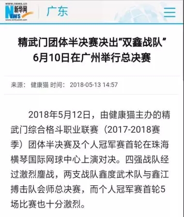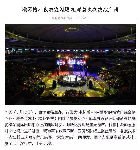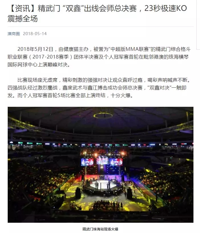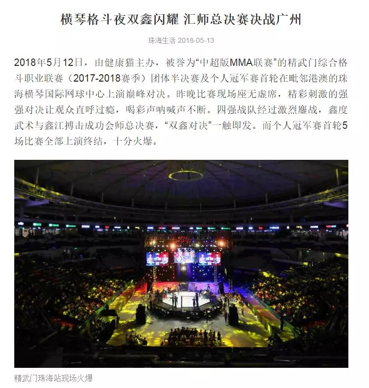 2018年5月12日,精武門綜合格斗職業(yè)聯(lián)賽(2017—2018賽季)團(tuán)體半決賽在珠海橫琴國際網(wǎng)球中心圓滿落幕。鑫江搏擊3:2險(xiǎn)勝商丘波帕姆,成功拿到團(tuán)體總決賽的入場券。