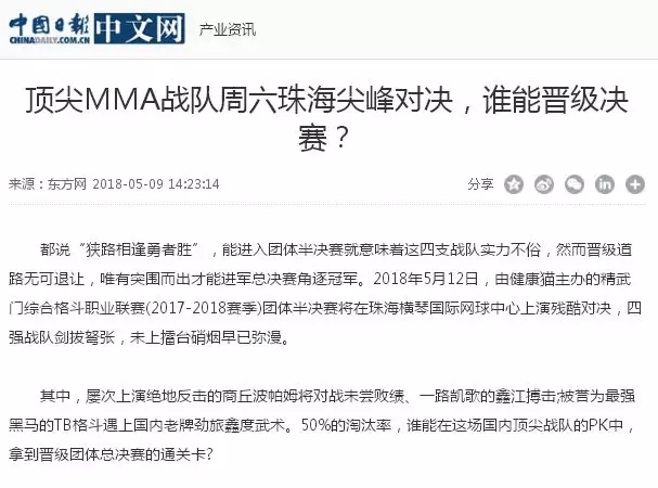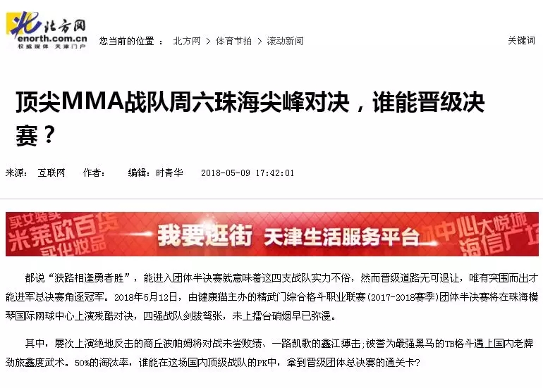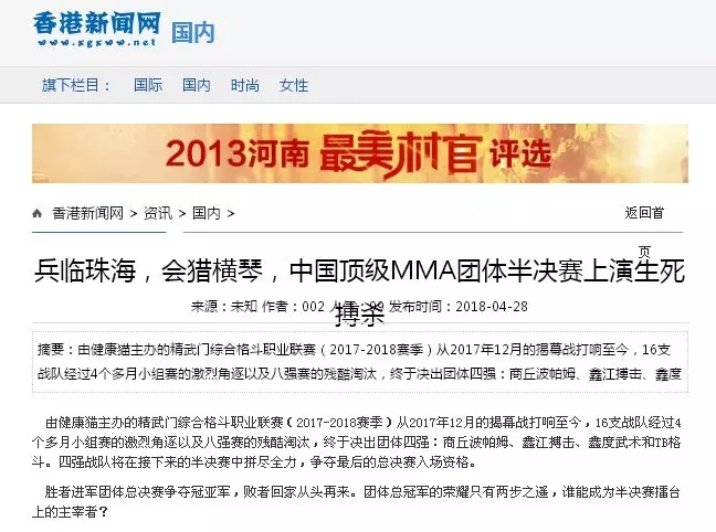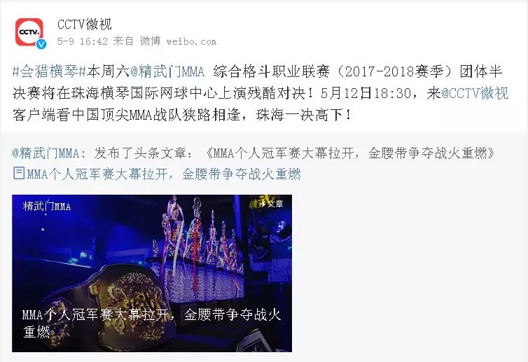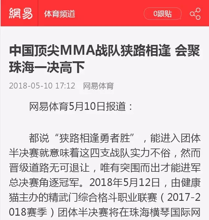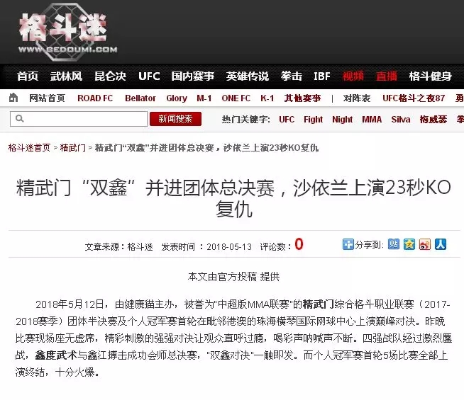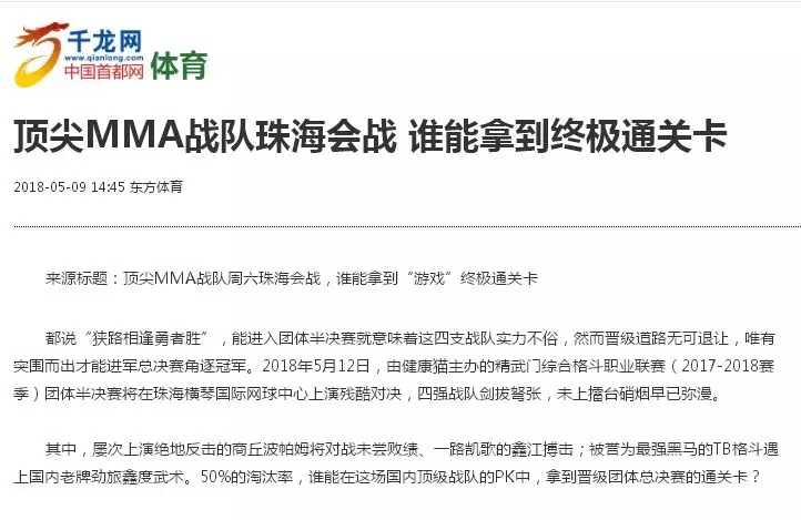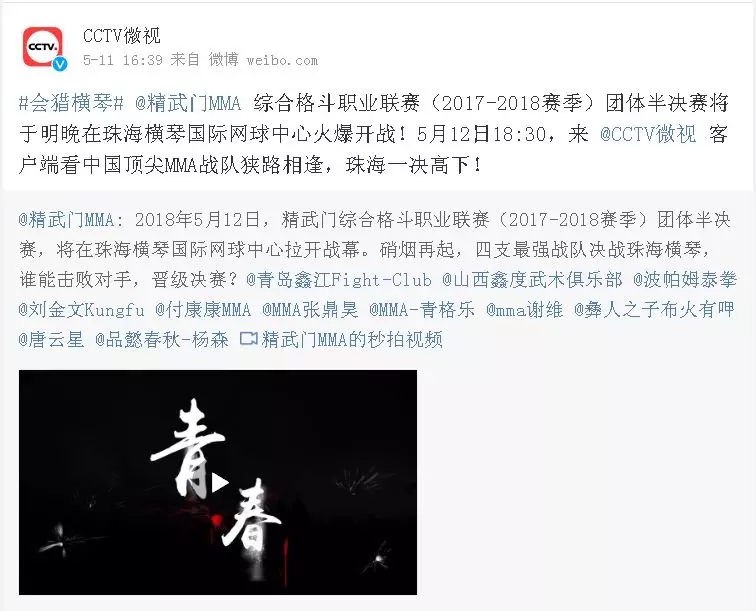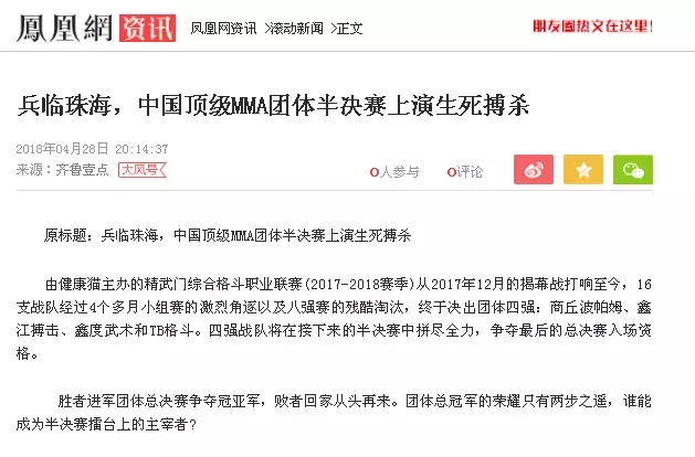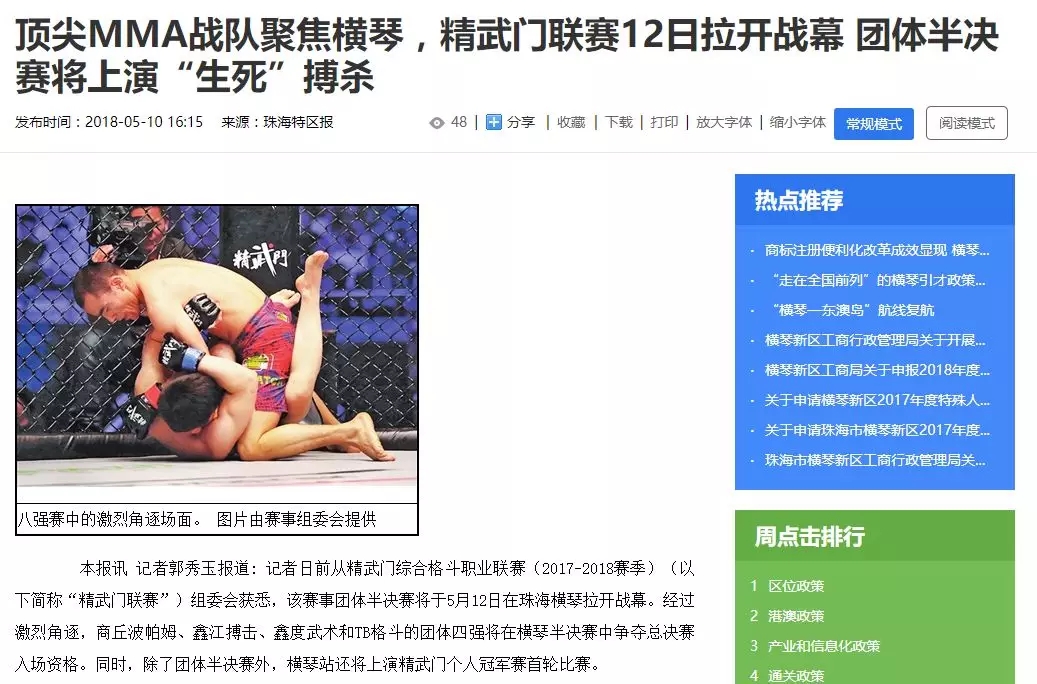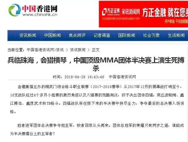 2018年5月12日,精武門綜合格斗職業(yè)聯(lián)賽(2017—2018賽季)團(tuán)體半決賽在珠海橫琴國際網(wǎng)球中心圓滿落幕。鑫江搏擊3:2險(xiǎn)勝商丘波帕姆,成功拿到團(tuán)體總決賽的入場券。
