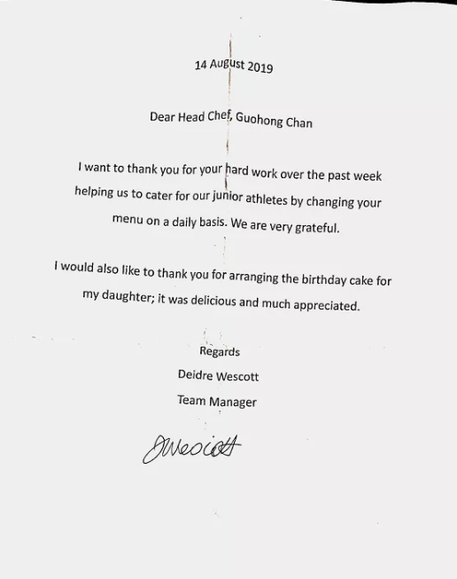 青島鑫江溫德姆酒店團隊,辛勤的服務(wù)和付出和努力,得到了入住球隊的認可。我們收到了來自澳大利亞球隊秘書,及新西蘭球隊理事的書面感謝信。大家對酒店廚師長,及廚師團隊表達了親切的問候與感謝,特別對酒店健康、豐富的食材,搭配均衡的三餐,以及親情化的服務(wù)表達了感謝。新西蘭球隊理事,更是希望以后在中國的團隊,都由溫德姆酒店提供服務(wù)。