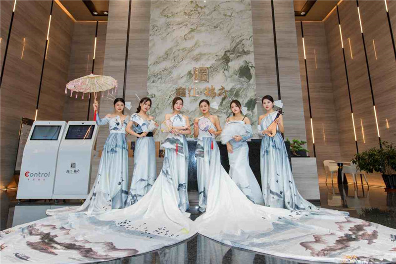 雨中的歆湖云霧繚繞,臥虹橋仿佛在訴說一段古老而美麗的故事。中式園林中,身著精美古裝的佳人仕女,曼妙若畫,在旖旎的禮樂中上演一曲醉人如夢,將示范區的東方之美和風華絕代淋漓盡致地展現于眼前。攬勝軒內,精心準備的茶藝表演讓在場嘉賓沉醉其中,品茗、賞景、談笑風生。