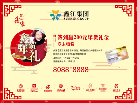 1月2日-1月21日,關(guān)注【鑫江集團(tuán)】微信公眾號,在線報名申請年貨禮金,期間累計簽到十次,即有機(jī)會免費(fèi)參與1月21日,禮金直播抽獎,現(xiàn)場抽出200位獲獎粉絲,每位送出200元年貨禮金!