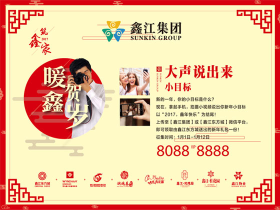 1月1日-1月12日,拍攝小視頻,說出你的新年小目標(biāo),以“2017,鑫年快樂“為結(jié)尾,上傳至【鑫江集團(tuán)】或【鑫江東方城】微信公眾號,即可免費(fèi)領(lǐng)取新年禮包一份,同時,1月21日-27日,【青島東方城】微信公眾號,將開啟在線有獎轉(zhuǎn)發(fā),轉(zhuǎn)發(fā)視頻圖文至朋友圈,即可免費(fèi)領(lǐng)取新年好禮一份。
